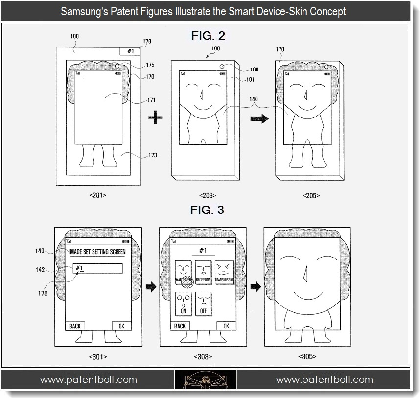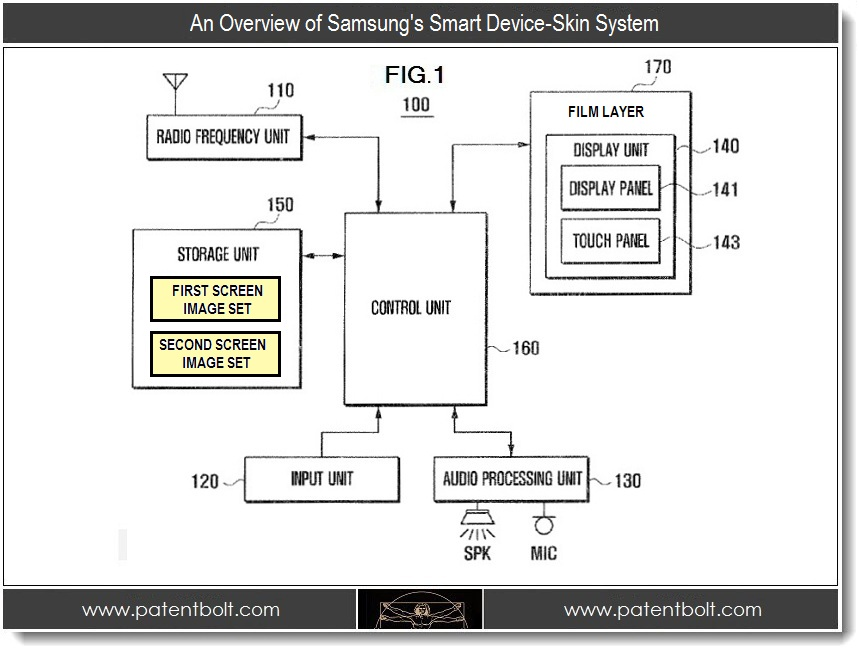 Sarà possibile, magari, scattare una foto ed ingrandirla per espanderla in lungo e in largo per la dimensione del display e richiuderla su se stessa facendo combaciare gli estremi della foto, in modo da creare uno sfondo unico che si prolunghi sia anche sulla superficie frontale, sia su quella laterale, sia su quella posteriore del dispositivo.Ecco l’immagine dello schema a blocchi circuitale del brevetto degli Smart device-skin: